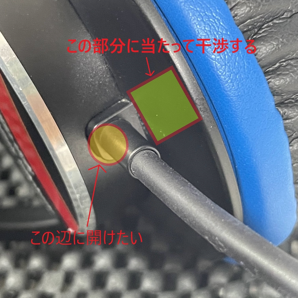 もっと中心に穴を開けないと、ジャックやプラグが干渉します。